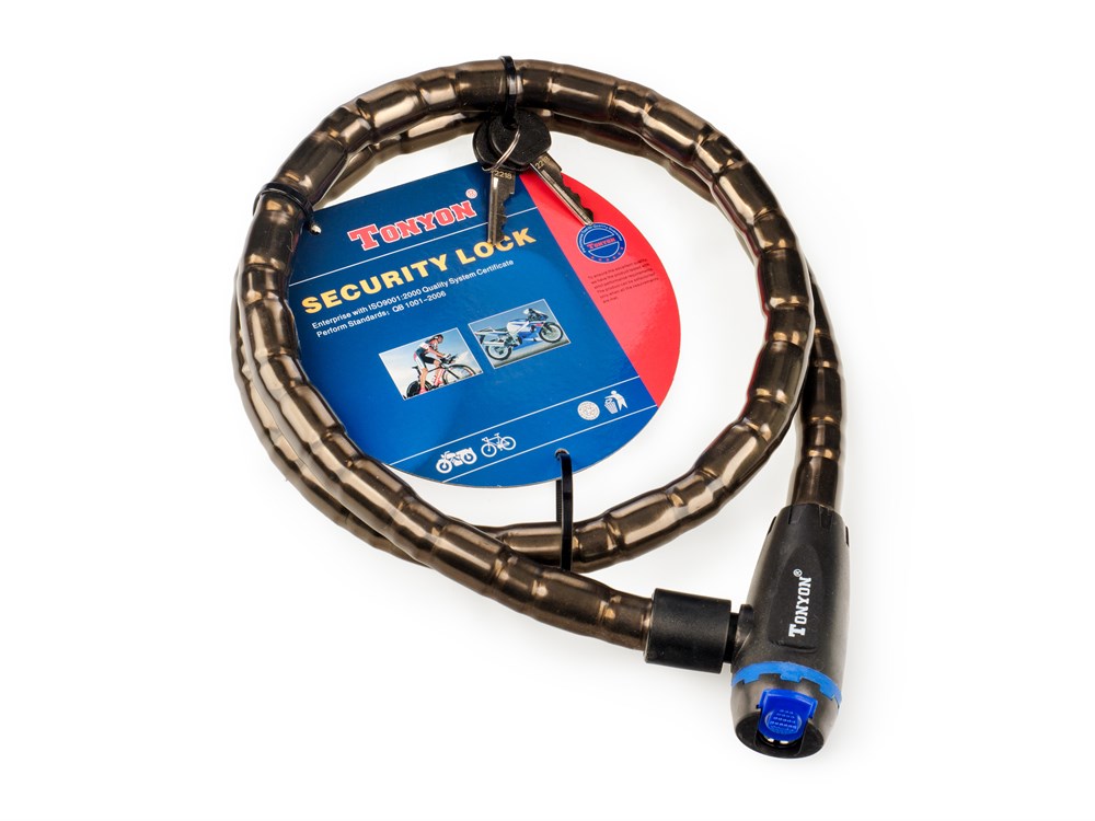 Трос с полимерным покрытием не оставляет царапин на велосипеде и зацепов на одежде